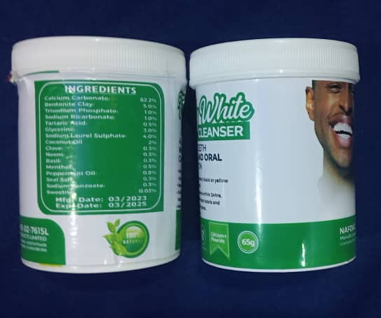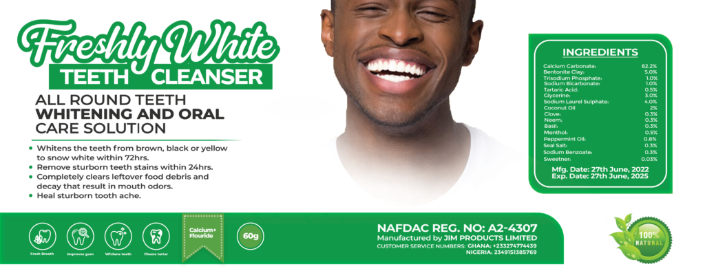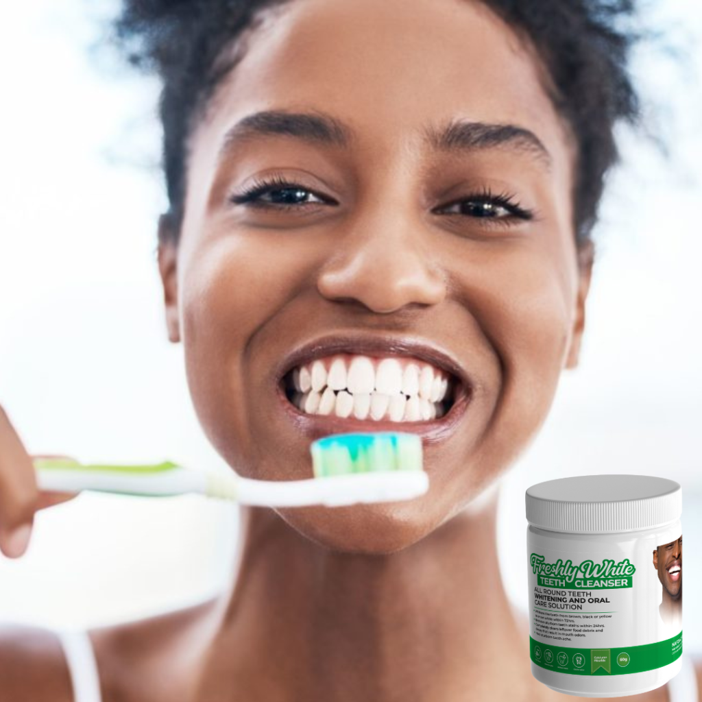 Our ALL-ROUND FRESHLYWHITE TEETH CLEANSER powder removes teeth stains, tooth ache, and bad breath effectively and flawlessly with 100% safe and natural ingredients. Experience visible whitening effect after the first use.
