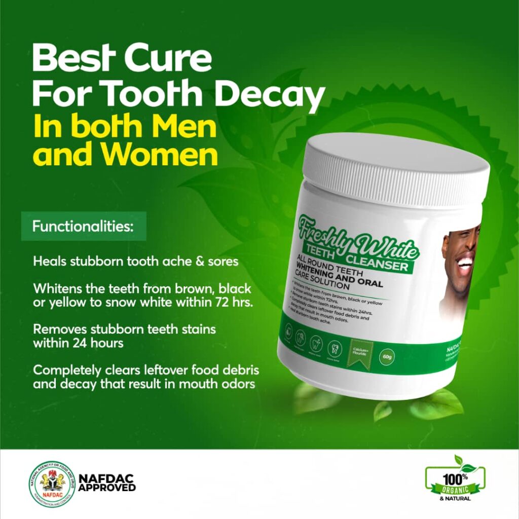 This Freshly White teeth cleanser and whitening powder clears toxins and germs completely. Just incase you are having tooth rot/decay, tooth ache/sores, this is the best herbal powder for you. The active ingredients contained in this powder fights everything off completely.